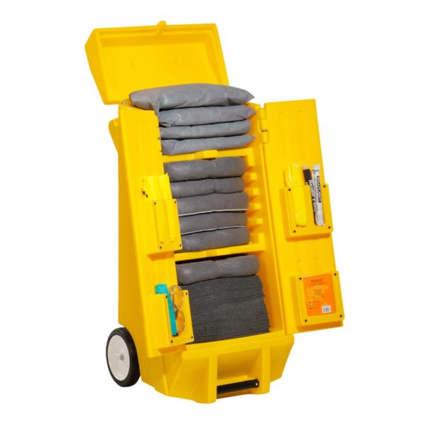 Mobile Universal spill kit in a wheeled kaddie with handles for carrying or pushing. Interior shelves and compartments are packed with absorbents and safety gear to help you safely and quickly respond to and contain water, oil, coolant and solvent spills. Kaddie Spill Kit fits easily through narrow aisles and doorways.